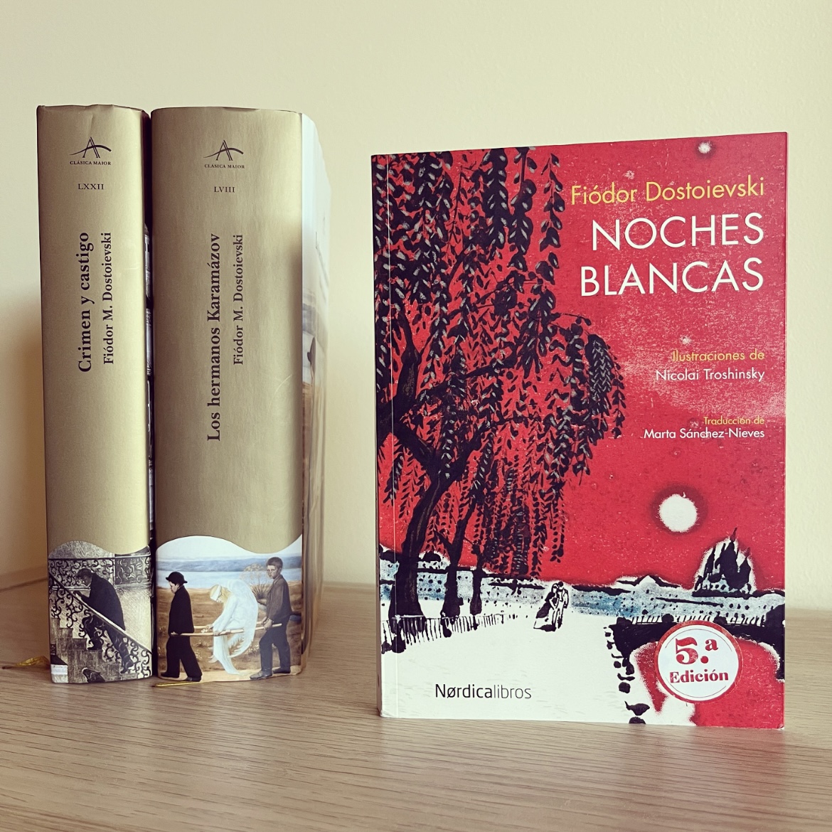 La semana pasada ya advertí que insistiría con la colección de cuentos ilustrados de Nórdica. Hoy os traigo Noches blancas, un relato de Fiódor Dostoievski, publicado originalmente en 1848, y que ahora Nórdica nos lo presenta en su colección con ilustraciones de Nicolai Troshinsky y la premiada traducción de Marta Sánchez-Nieves. El título hace referencia a un fenómeno natural que tiene lugar durante el solsticio de verano en altas latitudes como la de San Petersburgo, donde las puestas de sol son tardías y los amaneceres más tempranos. Como consecuencia de esto, la oscuridad nunca es completa.